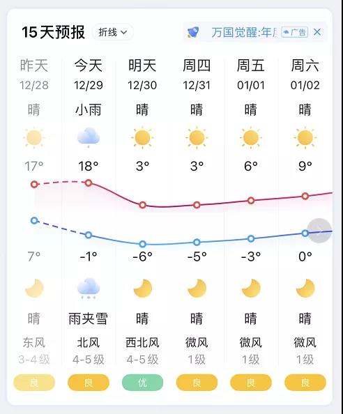 雨雪低温等恶劣天气非必须不外出,出行前合理规划时间。无论开车还是走路,注意出行慢行,防止滑倒。